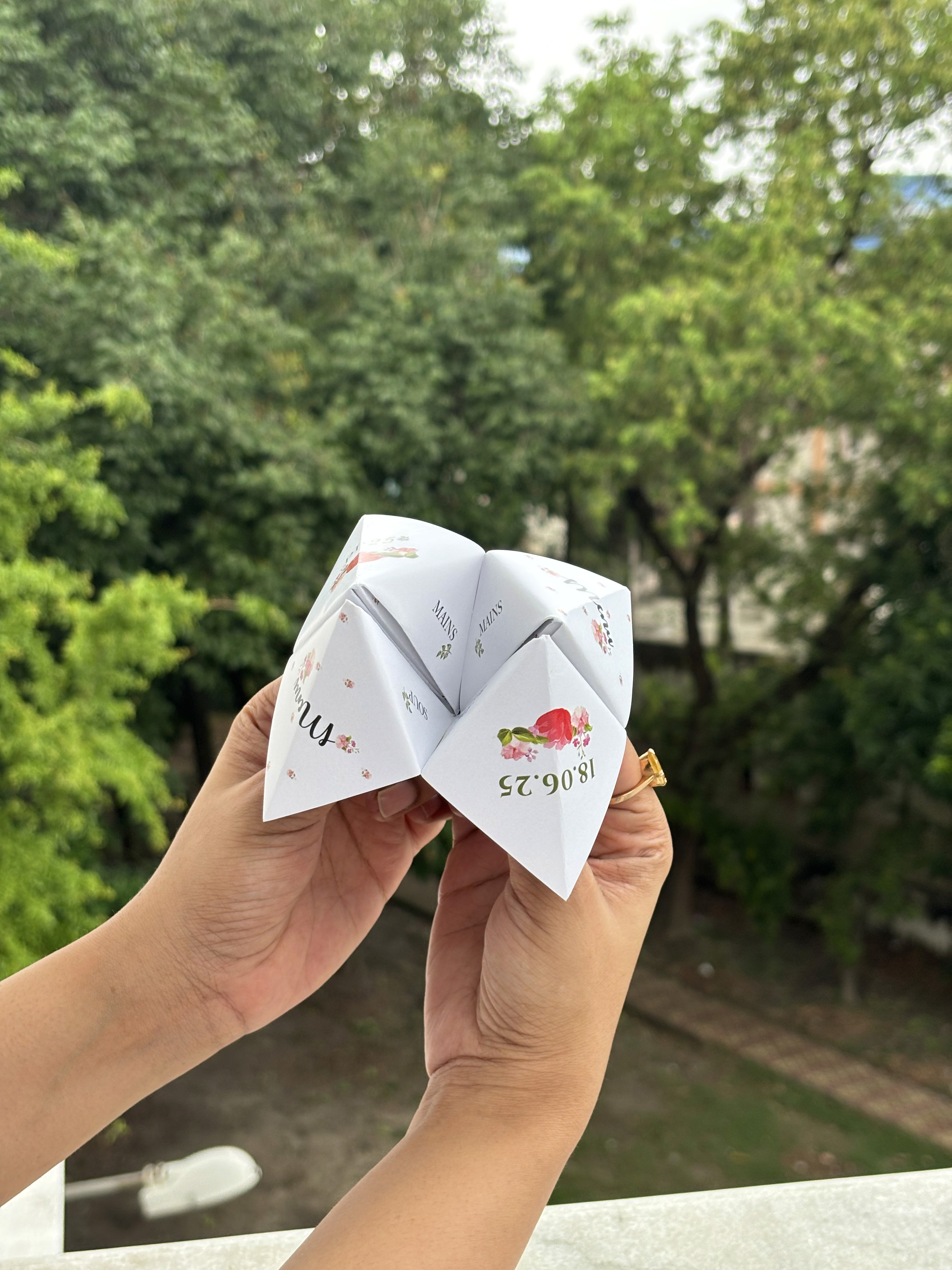 Interactive menu styled like a childhood paper fortune teller — playful yet elegant.