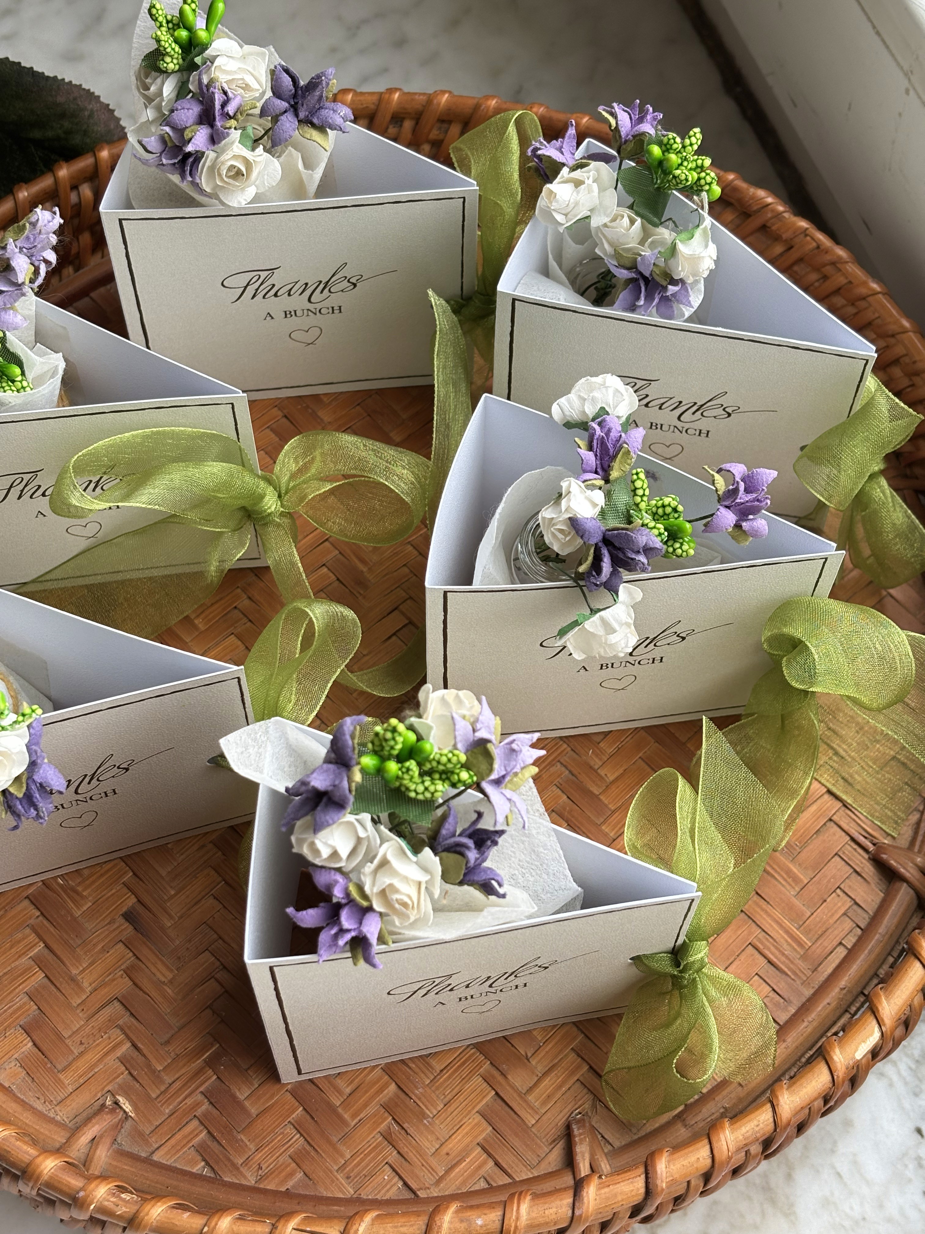 Thank-you card with delicate blooms in a mini vial — a charming blend of sophistication and creativity.