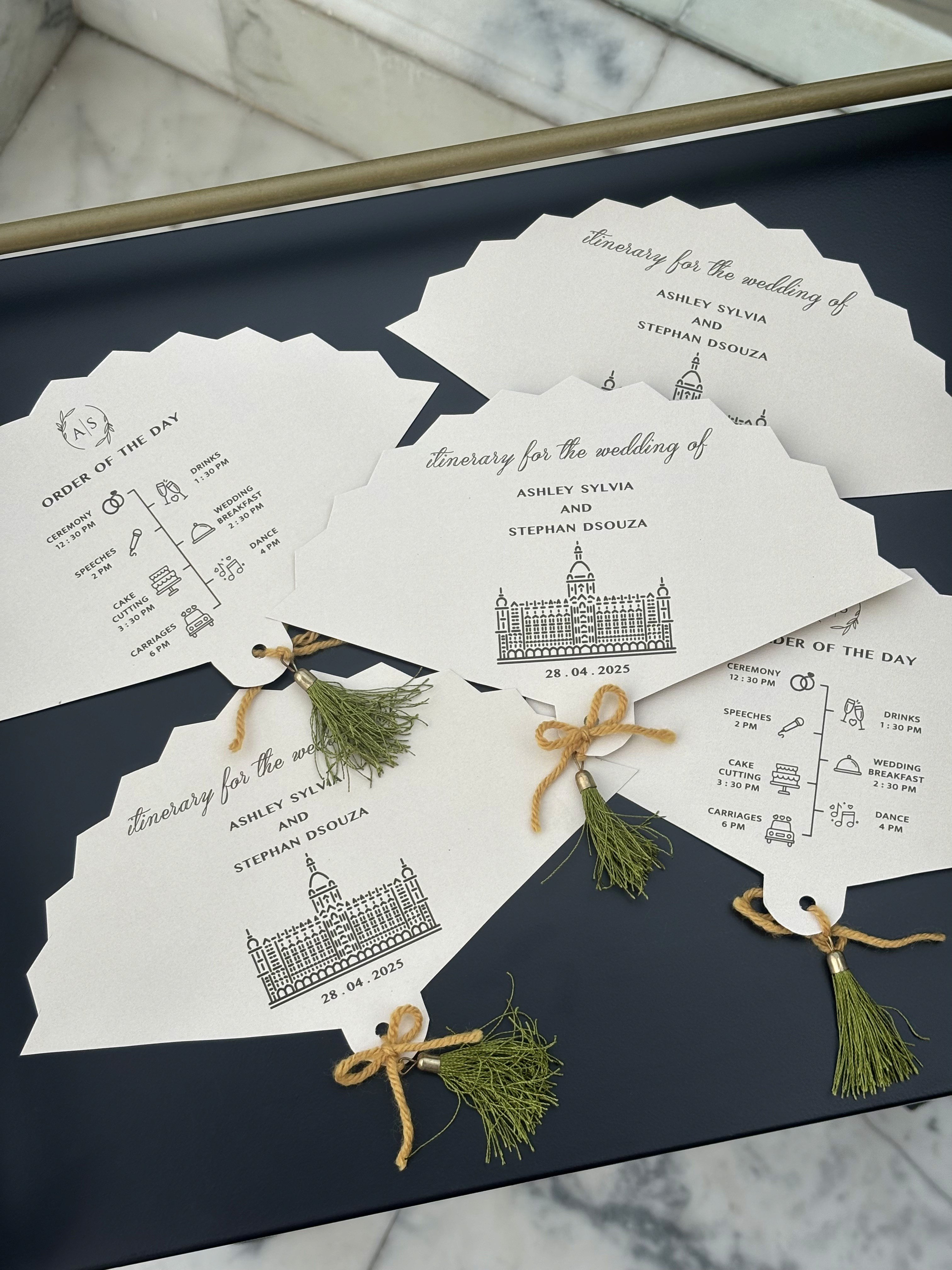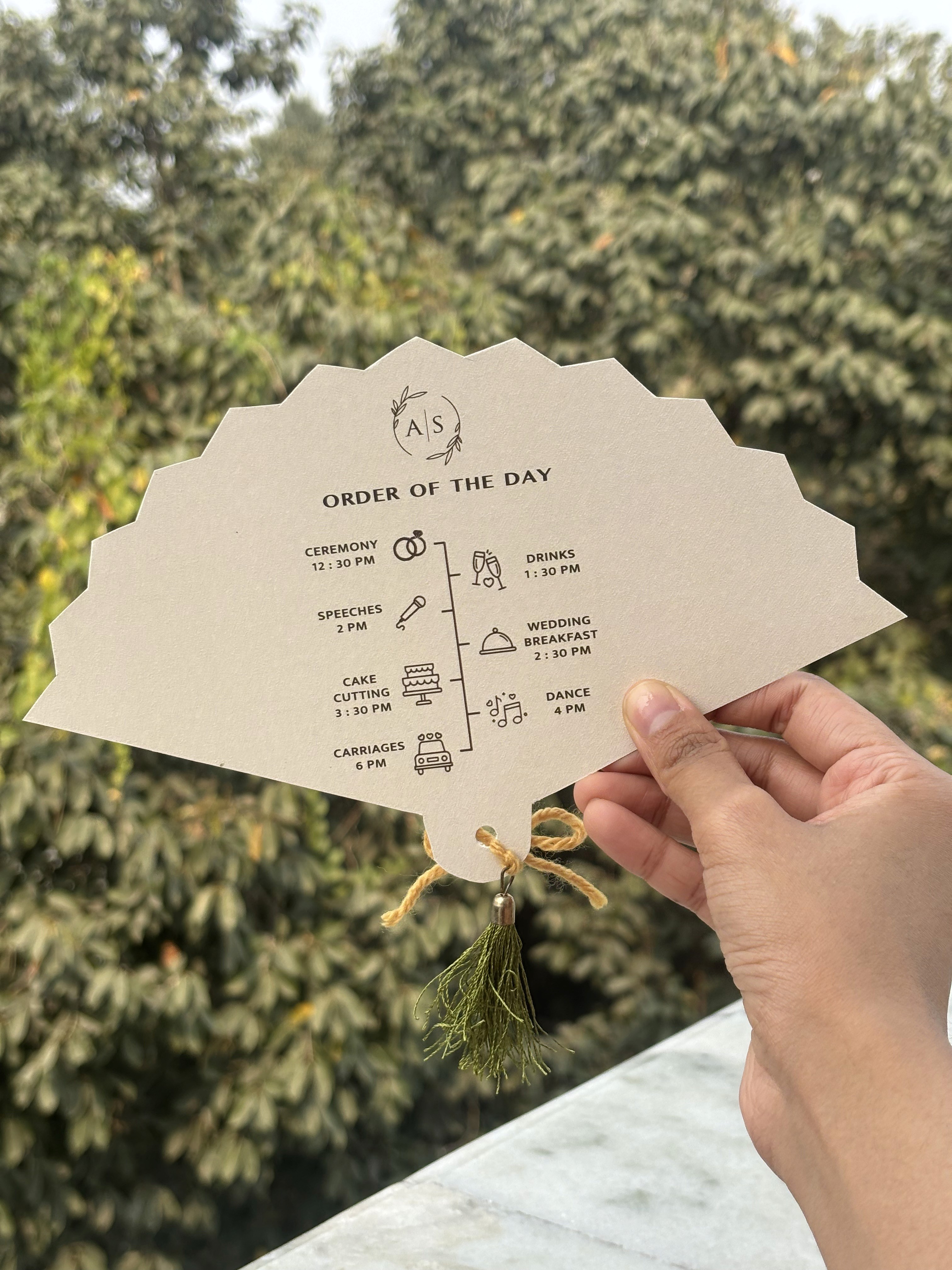 Fan-shaped wedding itinerary card with tassel detail — functional, elegant, and keepsake-worthy.