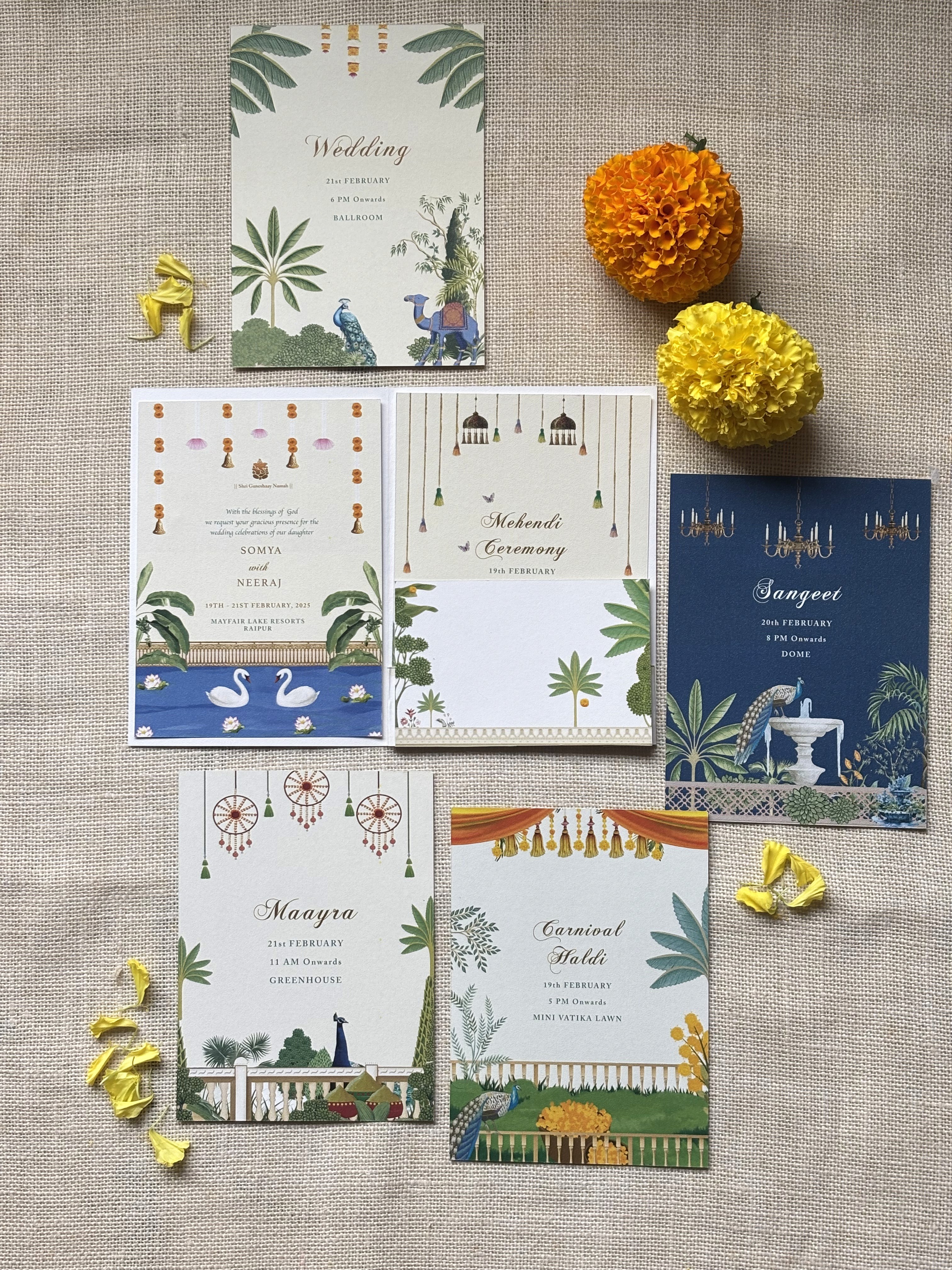 Royal Indian theme invitation with intricate illustrations and elegant paper detailing.