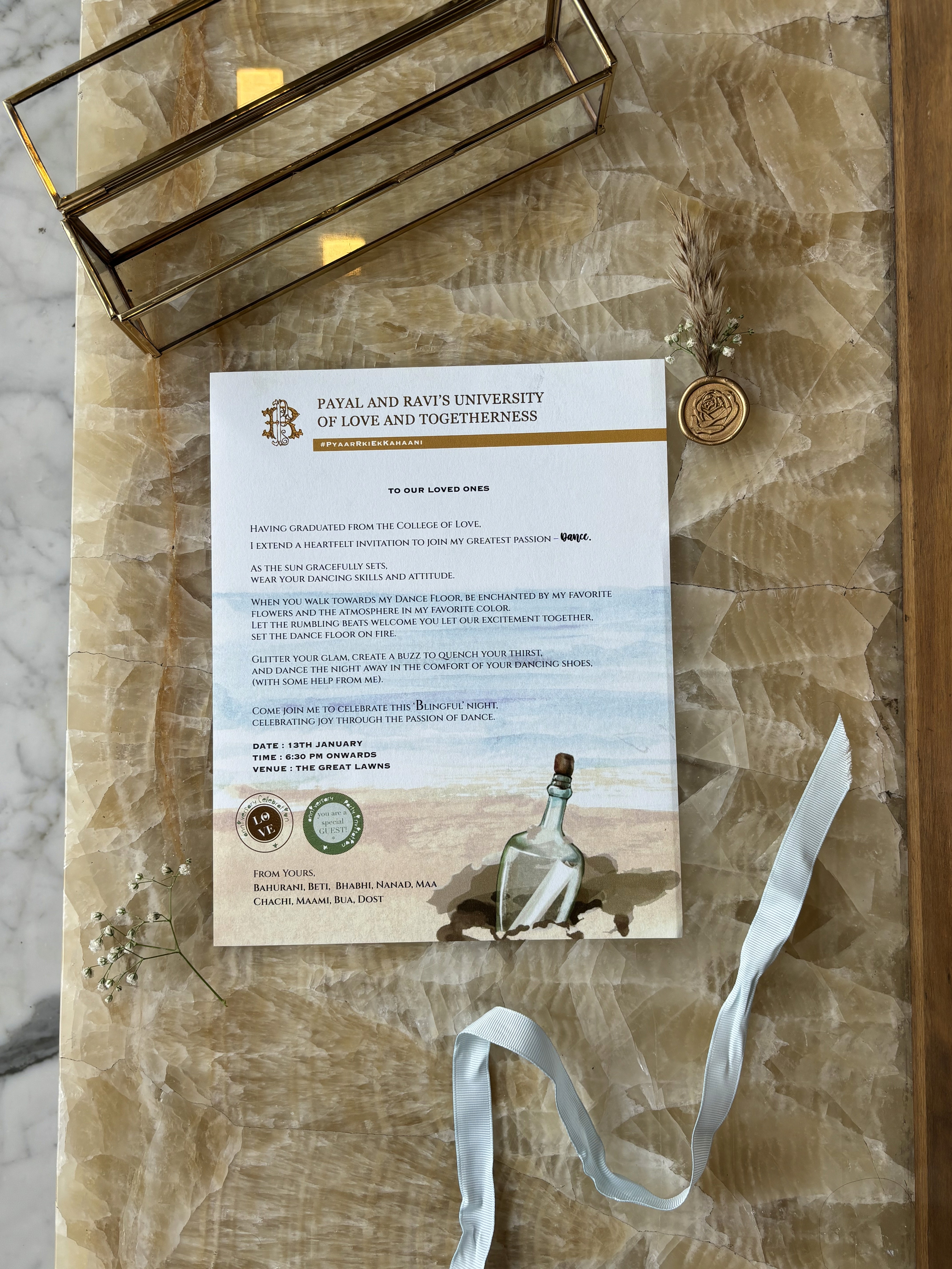 Premium scroll invite in a rectangular glass box, sealed with wax and boho accents.