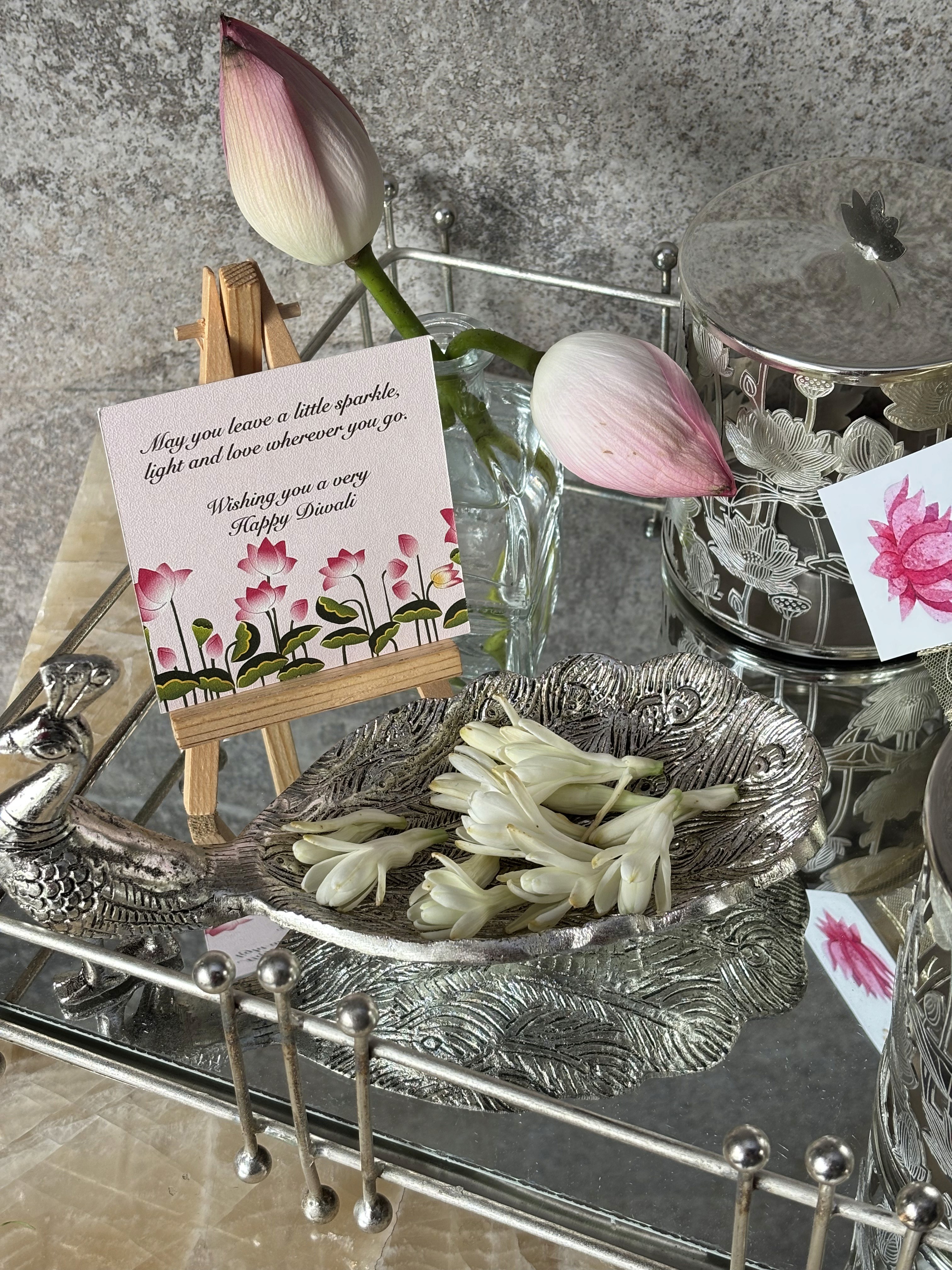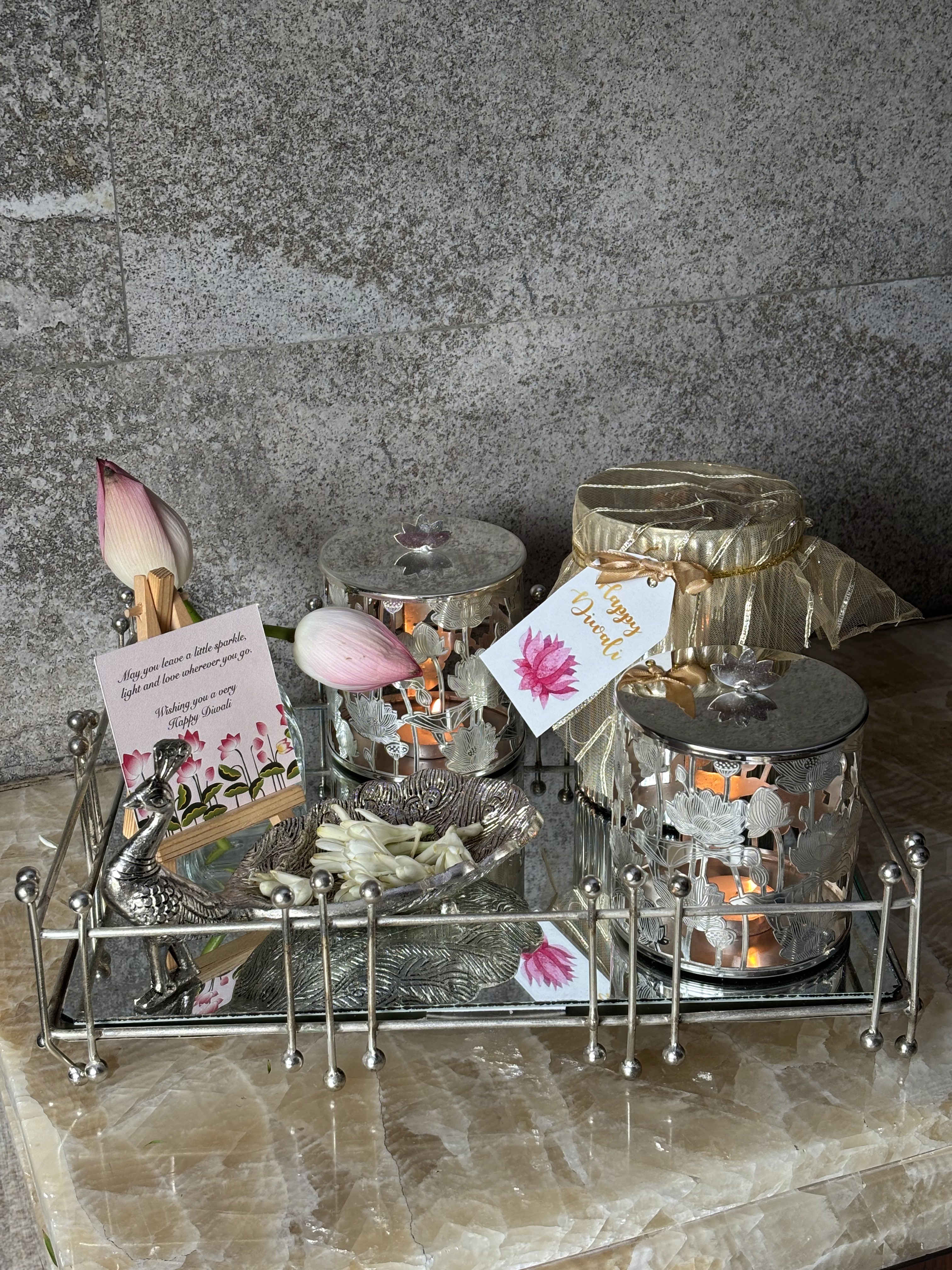 A grand festive hamper with silver-plated jars, German silver peacock trinket, glass jar, and glass tray — designed for refined, elegant celebrations.